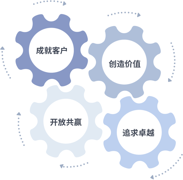 成就客户是一切决策的出发点,,,创造价值是衡量所有工作的标准,,,追求卓越是我们做事做人的态度,,,,开放共赢是我们的格局也是最终的结果。。价值观的齿轮环环相扣,,推动着组织里的每个人不断向前。。。