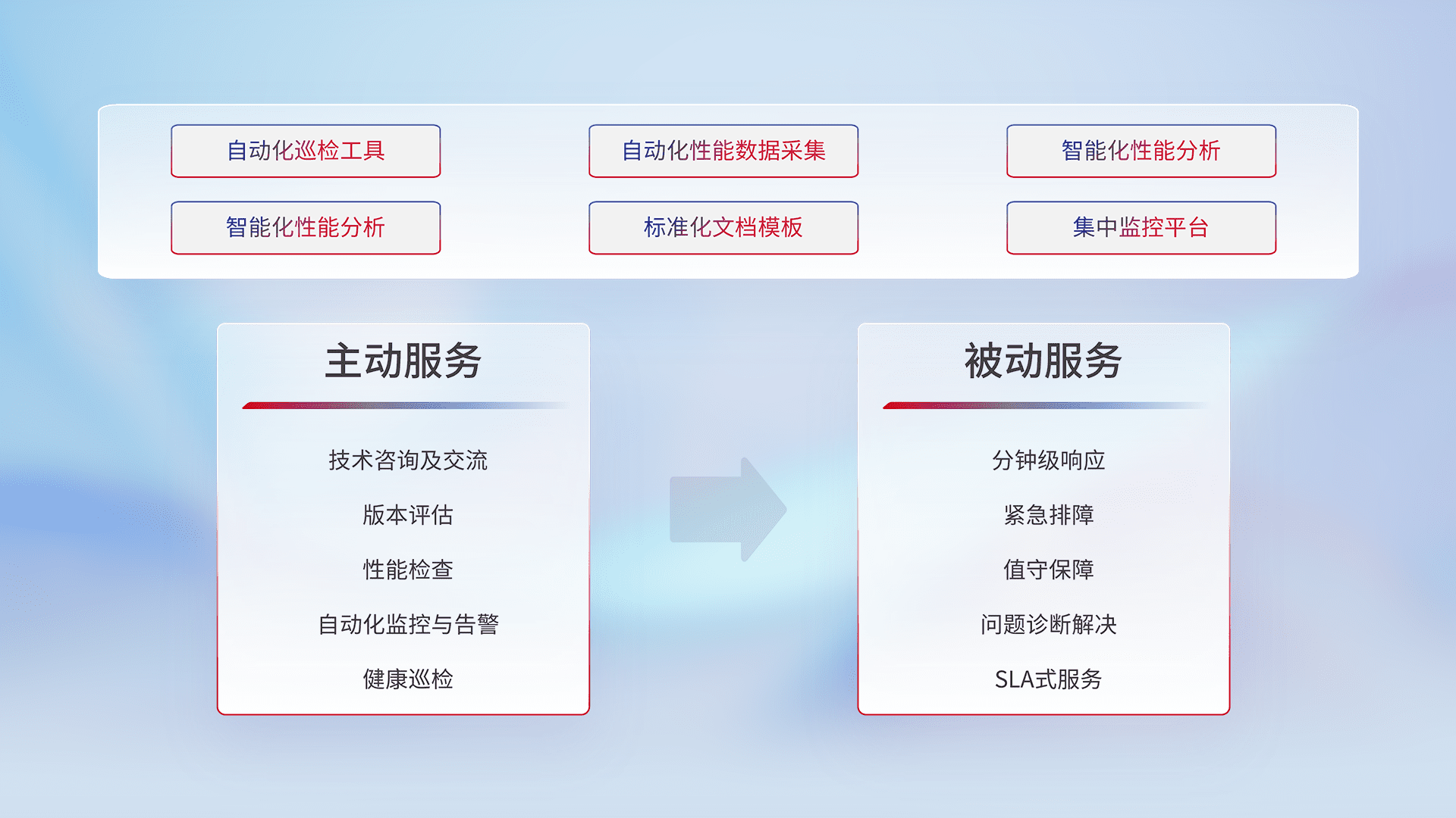 智能化工具和标准化文档,,,,保障服务质量,,,,提供主动服务(包含技术咨询、、、、版本评估、、性能检查、、自动化监控与告警、、、健康巡检)和被动服务包含(分钟级响应、、、紧急排障、、值守保障、、、、问题诊断解决、、SLA服务)。。